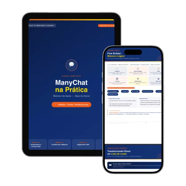 Um material de apoio para acompanhar as aulas, revisar os principais conceitos e facilitar a aplicação do ManyChat no seu negócio.
